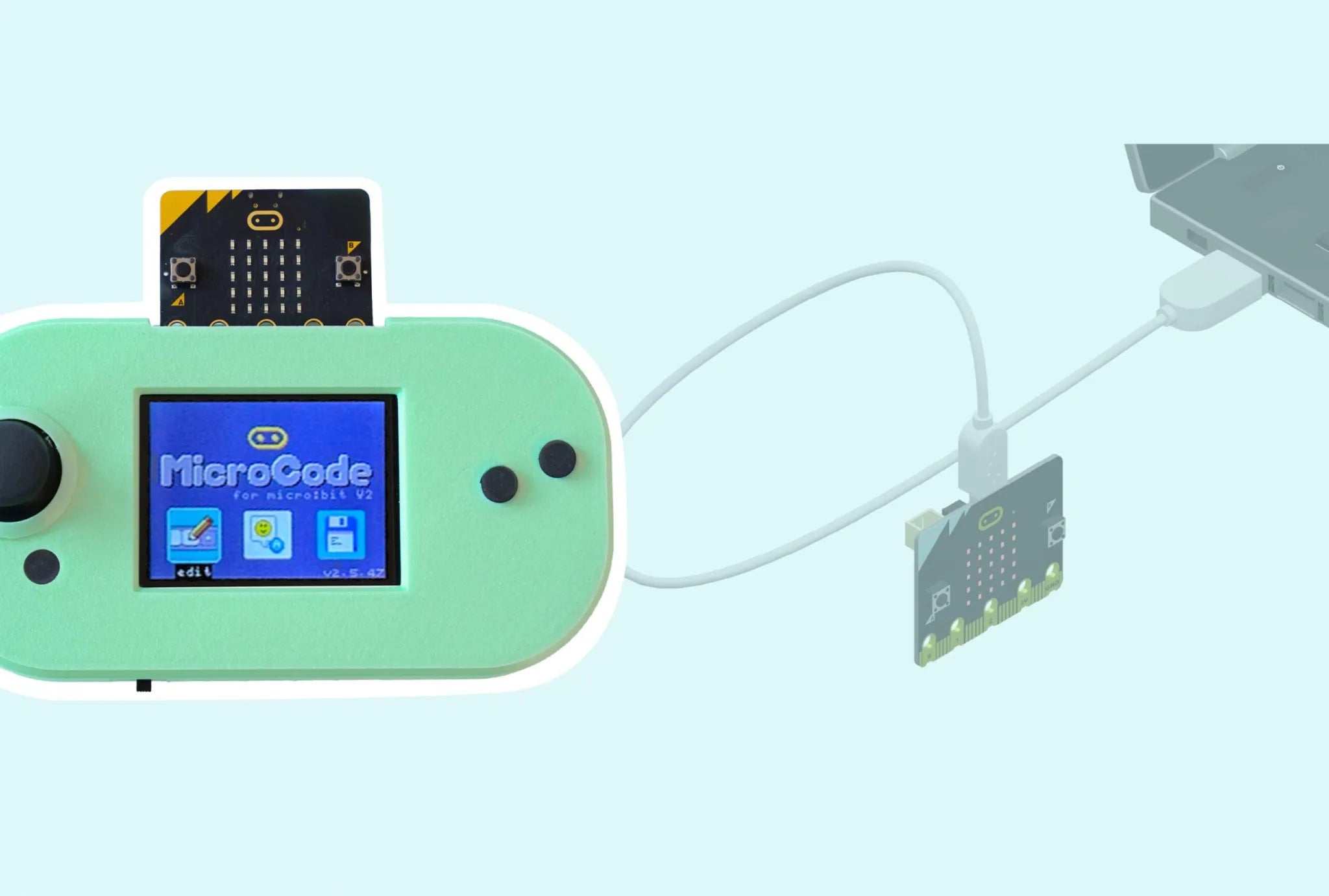 The CodeCTRL comes with the device itself and USB charging cable. A micro:bit V2 is required to use the device and is sold separately.