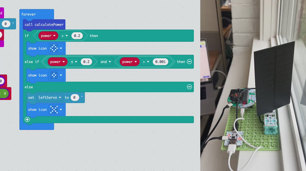 Use simple code blocks to change the position of the solar panel based on the voltage & current output - allowing for optimal energy generation.