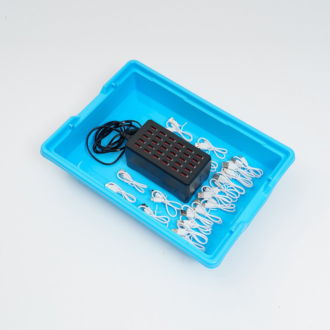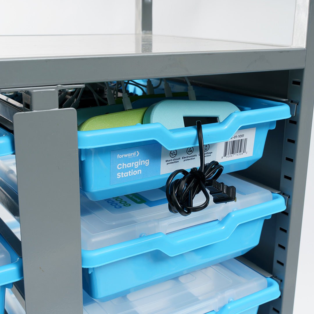 The Forward Education Charging Station is a compact solution for recharging Breakout Boards, CodeCTRLs, or other small robotic devices. The Charging Station contains a 20-port USB-A multi-charger, 20 x USB-A to mciroUSB cables, and a storage tray with lid.