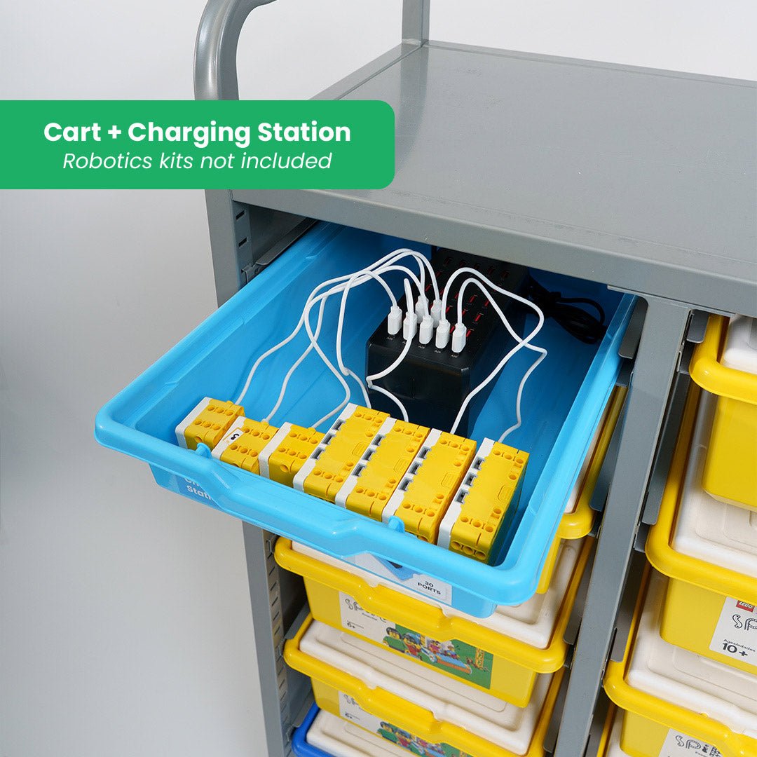This Robotics Kit Storage Cart offers a practical and space efficient storage solution for Forward Education's Climate Action Kit or LEGO® Education's SPIKE™ and BricQ kits. The storage cart offers an easy way to keep kits organized while saving valuable floor and shelf space. Its portable design makes it simple to store and transport robotics kits across classrooms or throughout a school or site.